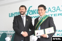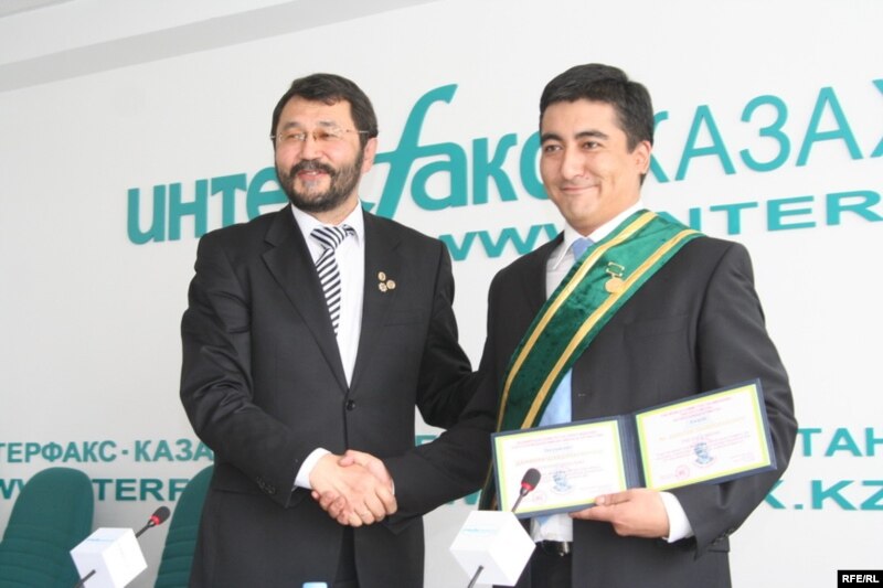 Рустан Рахманалиев, президент Всемирного комитета по присуждению «Золотой медали имени Чингиза Айтматова», вручает эту награду Данияру Шабдукаримову, президенту фонда «Алем Арт». Алматы, 10 июня 2009 года.