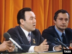 Нурсултан Назарбаев (слева) на пресс-конференции делегации Казахской ССР. Москва, 1981 год.