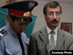 Сотрудник полиции производит арест правозащитника Евгения Жовтиса в зале суда. Баканас, 3 сентября 2009 года. Фото предоставлено газетой "Свобода слова".