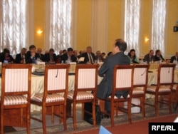 Участники конференции «Председательство Казахстана в ОБСЕ: вызовы и возможности» за столом переговоров. Астана, 28 октября 2009 года.