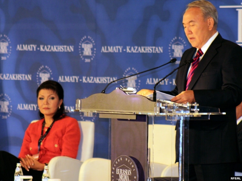Президент Казахстана Нурсултан Назарбаев выступает на открытии медиафорума, рядом сидит его дочь Дарига Назарбаева. Алматы, 27 апреля 2010 года.
