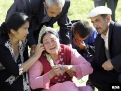 Люди принимают участие в мемориальной церемонии в честь погибших в апрельских столкновениях. Бишкек, 12 мая 2010 года.
