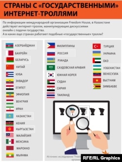 Согласно докладу Freedom House, в Казахстане «провластные тролли организовывают искусственные онлайн-обсуждения». Провластные тролли есть и в Азербайджане, Китае, Беларуси, России, Кыргызстане, Узбекистане, Иране, Турции и Украине, говорится в отчете.