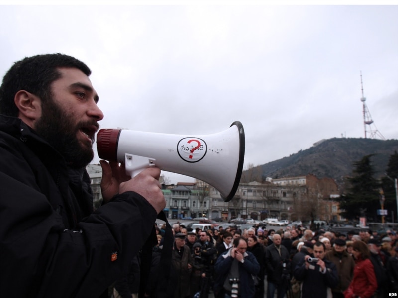 Демонстрация против сюжета «Имеди ТВ» о войне около здания офиса телеканала. Тбилиси, 14 марта 2010 года.