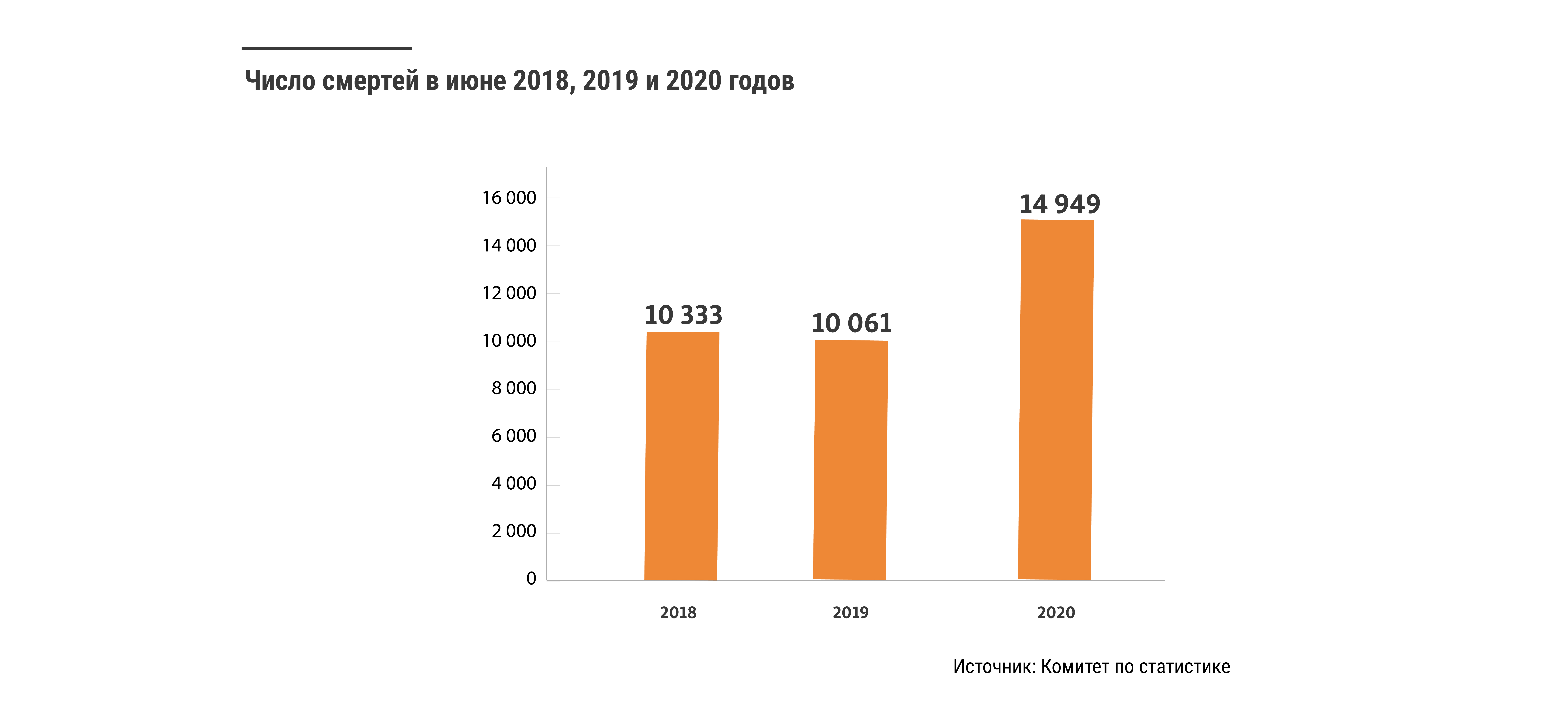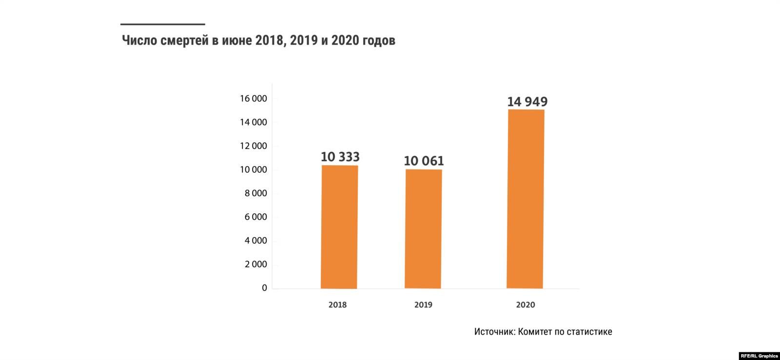 По данным комитета по статистике, в июне 2018 и 2019 годов скончалось около 10 тысяч человек, в этом году — почти 15 тысяч человек. Это 67-процентное увеличение по сравнению с прошлым годом. Согласно официальной статистике министерства здравоохранения, только 147 из 15 тысяч умерли от коронавируса.