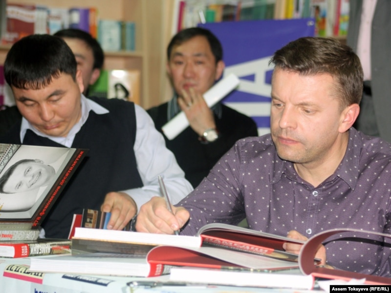 Русский журналист Леонид Парфенов раздает автографы читателям. Алматы, 4 марта 2010 года.