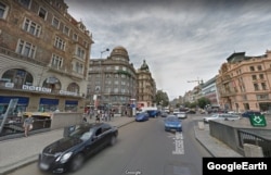 Советские самоходные артиллерийские установки на улице На Пршикопе (Na Příkopě), ныне одной из главных торговых улиц чешской столицы. На заднем плане площадь Республики и театр «Гиберния».